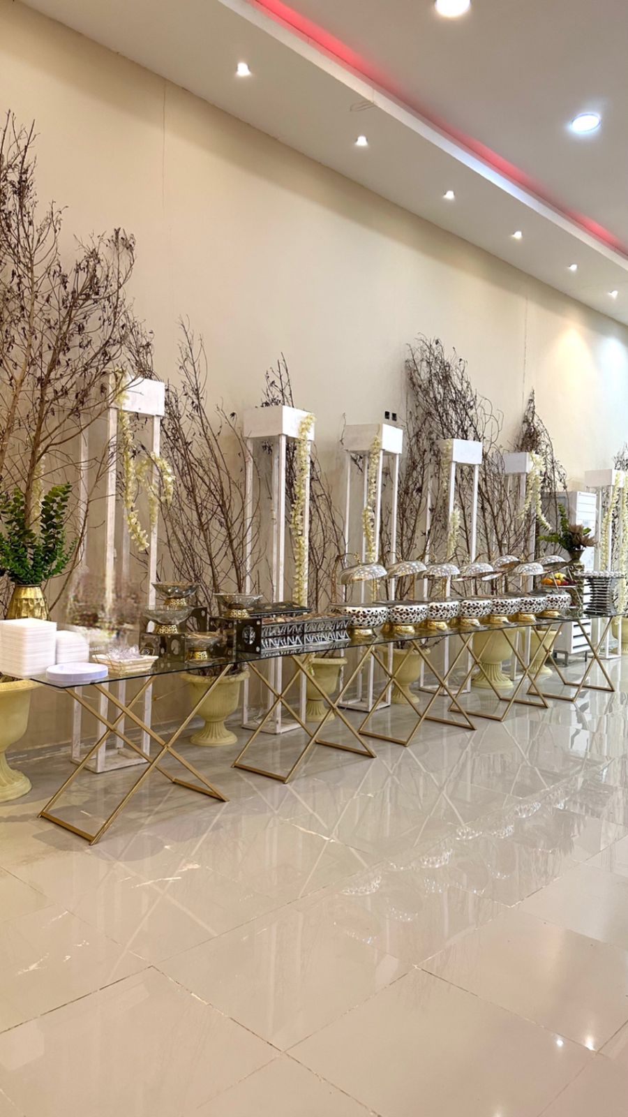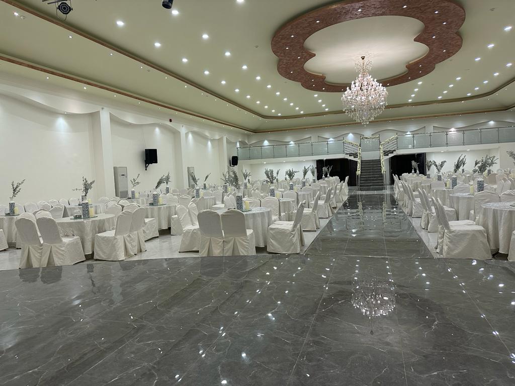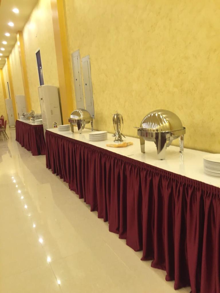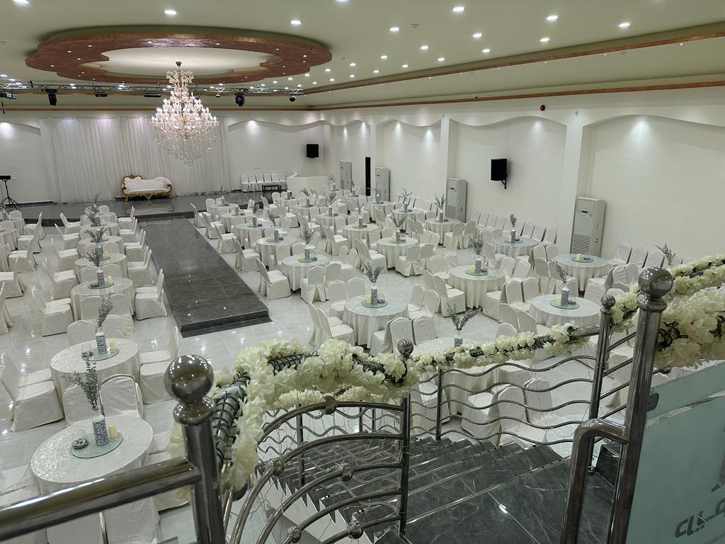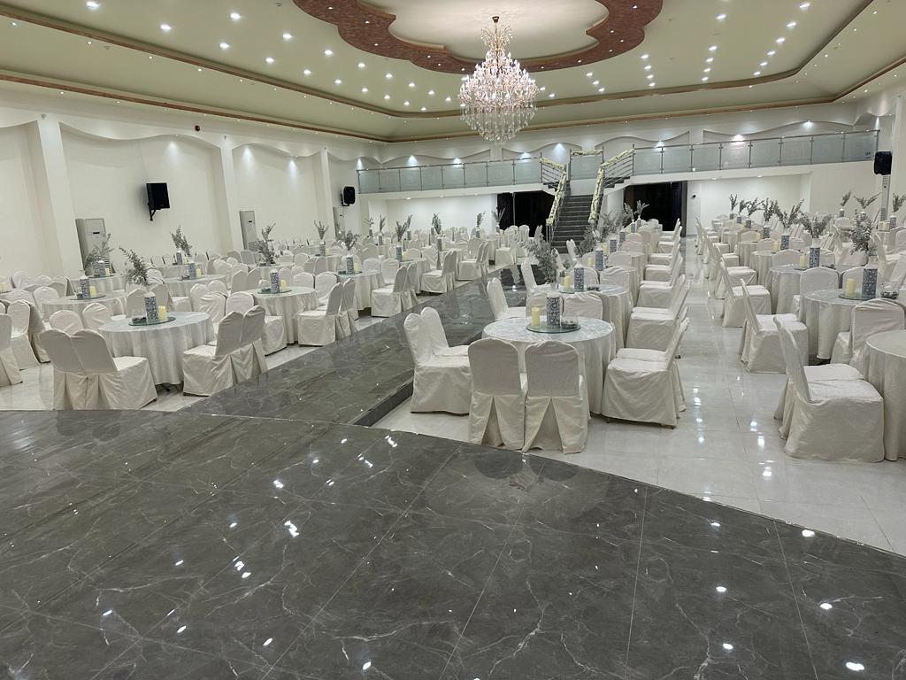 القاعة كاملة نساء ورجال مع طاولات البوفية