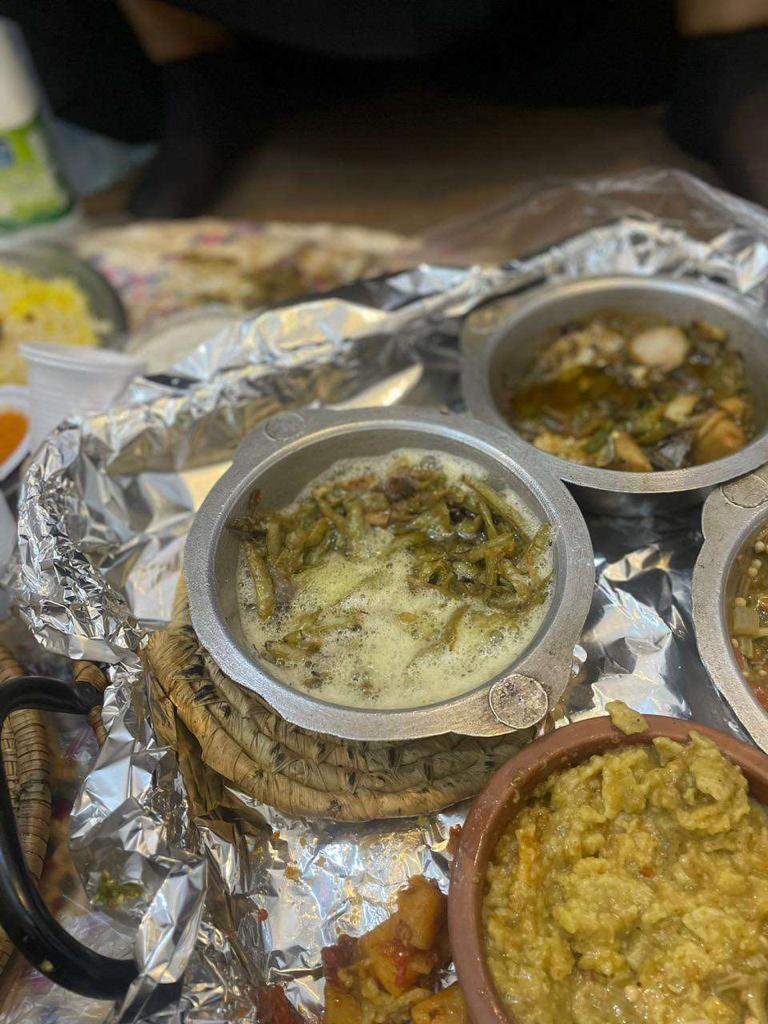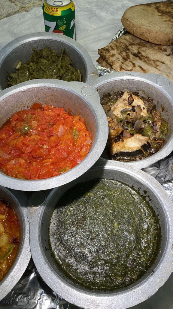 سفرة شعبية تتكون من (سمك+ قوار+ حيسية+ لحوح+ دقيق+ خمير+ ايدامات+ حلبة+ سلطة خضراء ورقية)