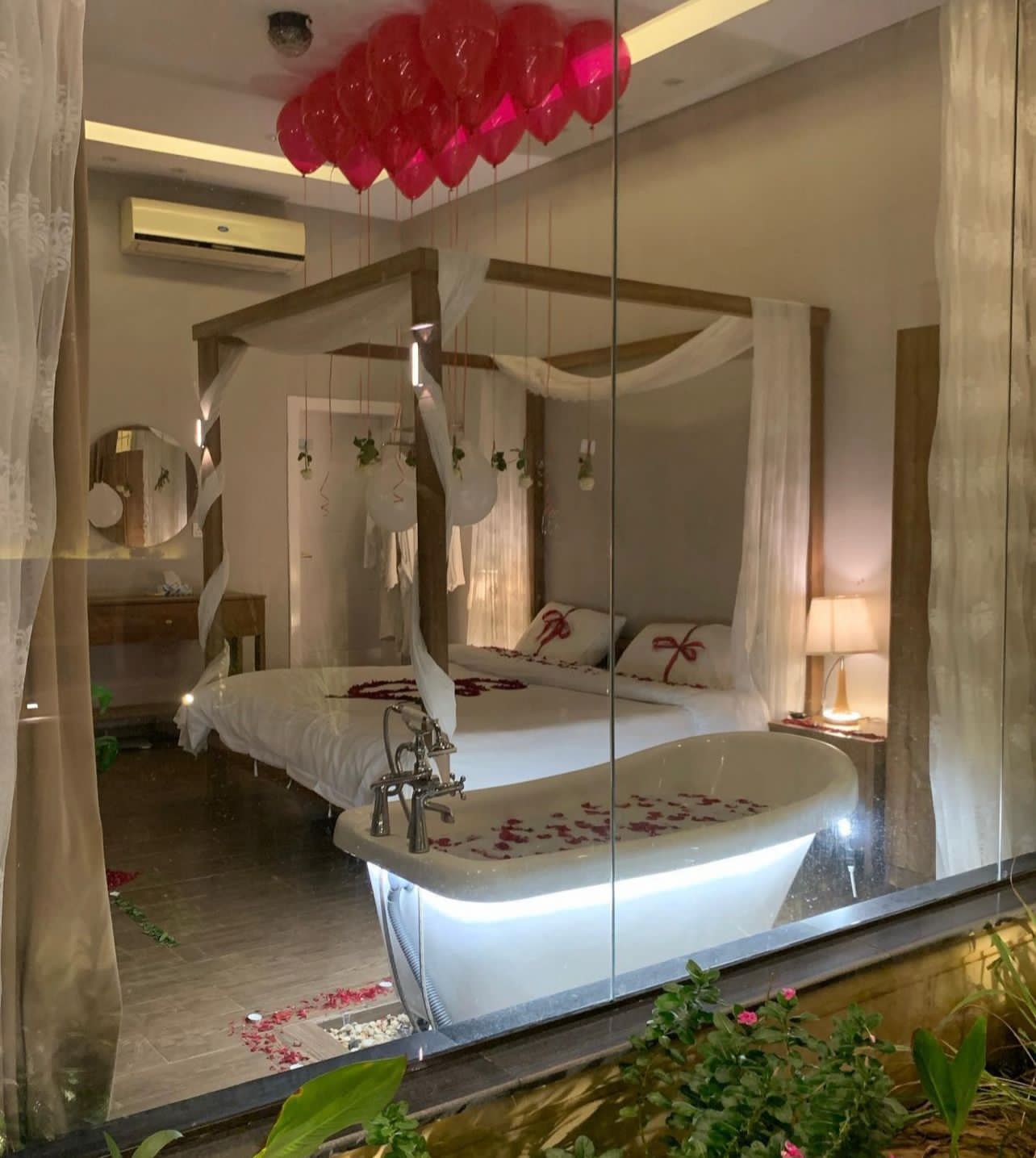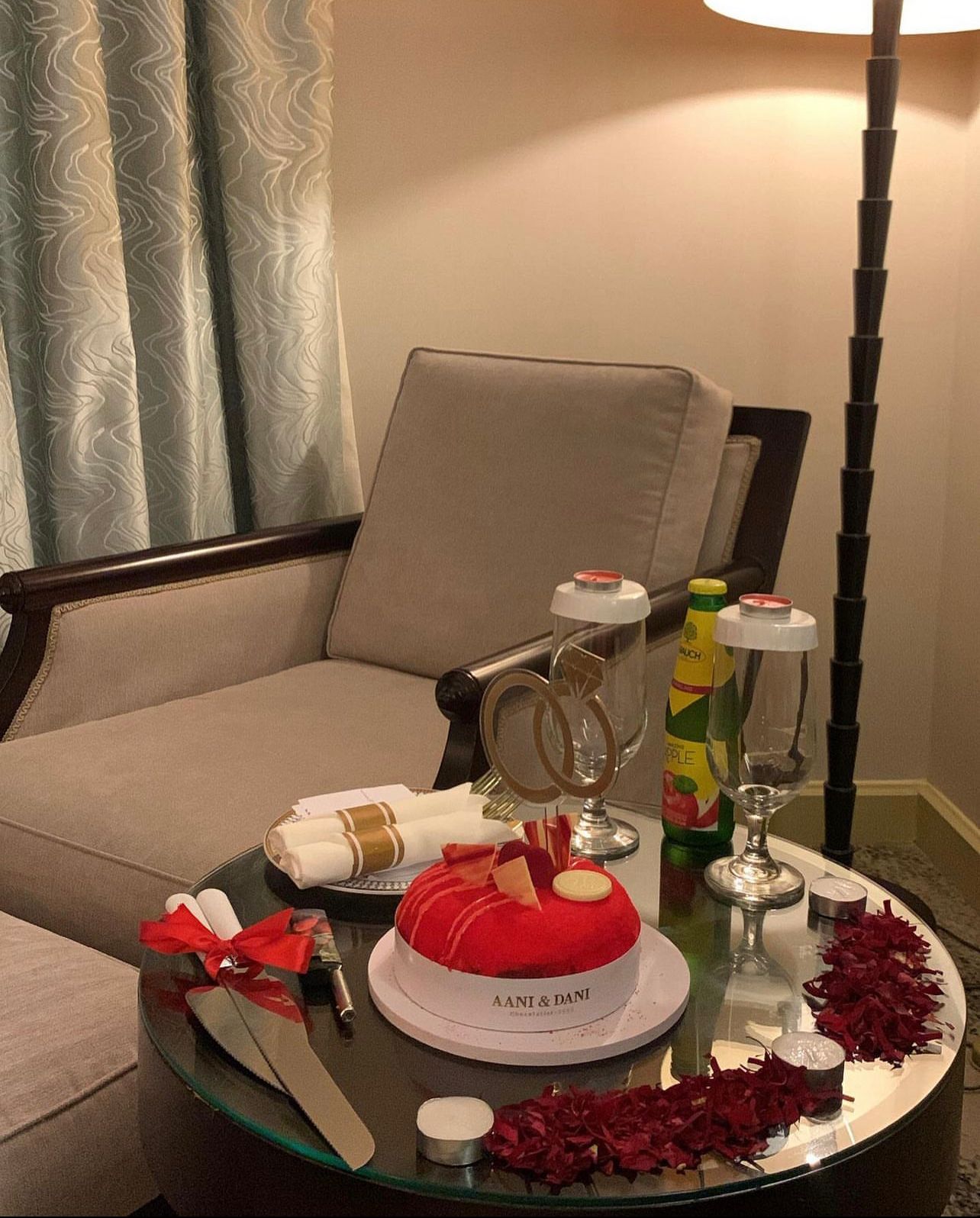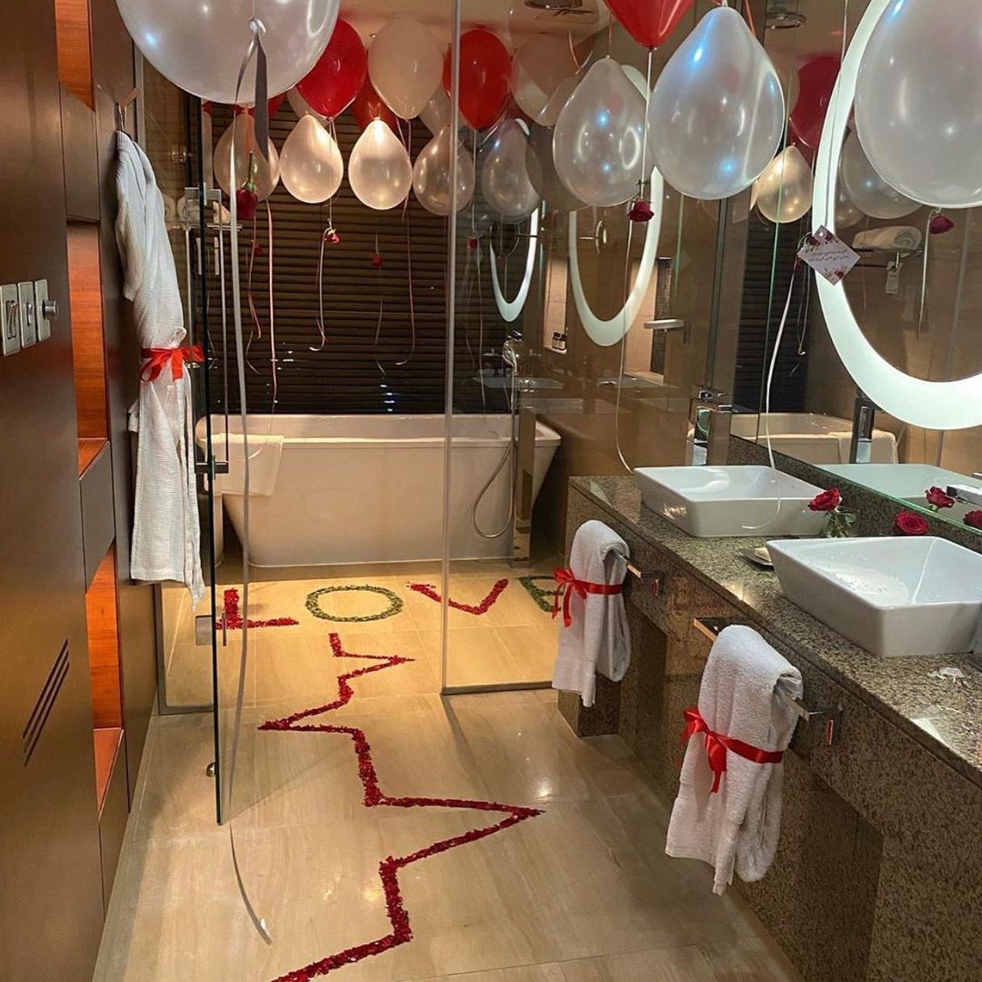 2-تنسيق السرير والمخدات ببتلات ورد طبيعي والشموع مع الرسم على السرير بالورد