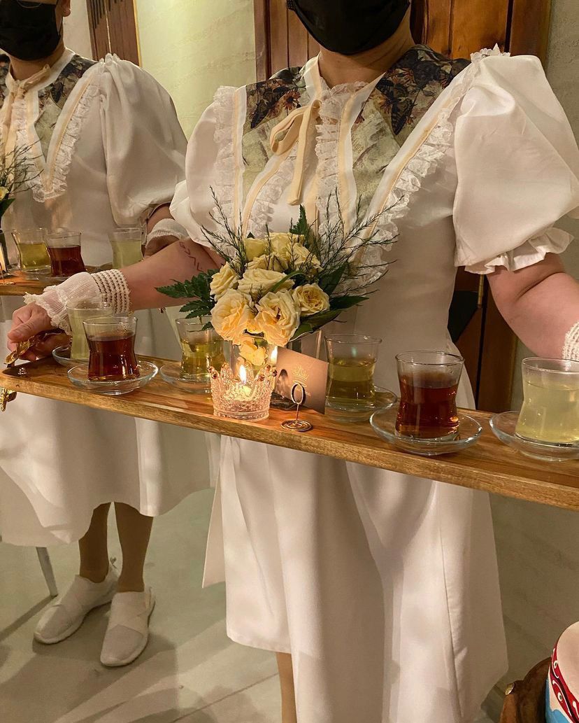 المشروبات الساخنة: قهوة عربية ، شاي أخضر وأحمر أو شاي بنكهات (حبق - نعناع - سكر) ، قهوة تركية تقدم مع قطعة سكر أو كابتشينو أو مشروب الورد